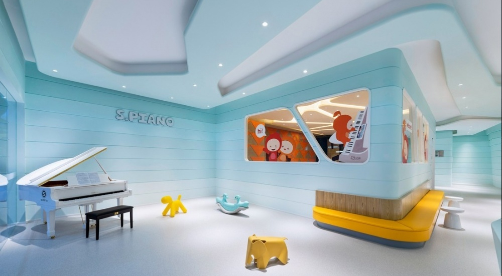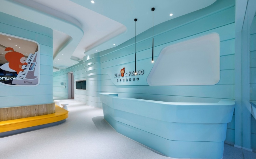 音樂是流淌的藝術,艾思鋼琴教學空間的整體布局,利用流暢的曲線,在流動的空間里合理規劃出多個小而獨立的教室,以夢幻漸變的淺藍色為空間主色調,墻面流動的曲線像富有節奏感的音符穿梭在整個空間。