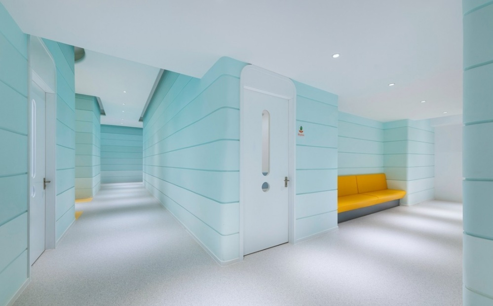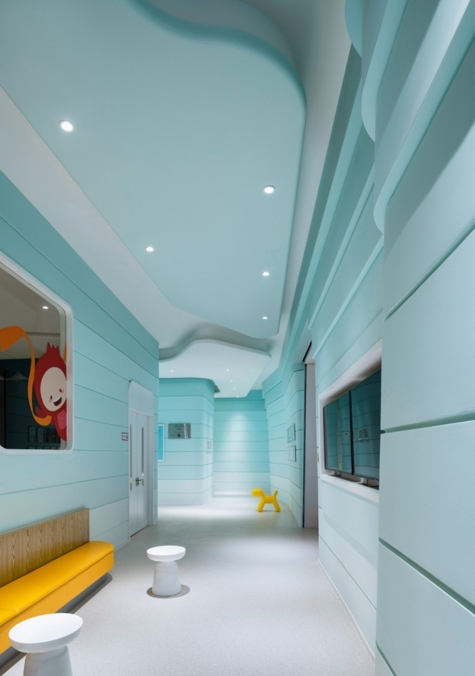 鑒于過道區域層高較高的優勢,設計師提出巖層山巒的概念結合鋼琴演奏中五線譜的元素營造層疊起伏的視覺效果。倒角的設計,為兒童的自由活動提高了安全性,同時讓空間過渡更加自然。