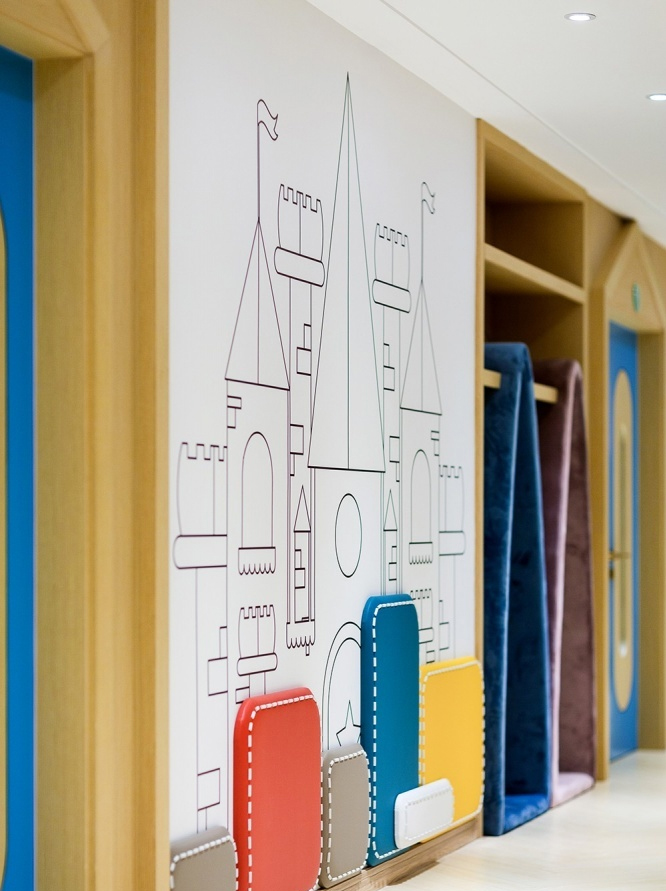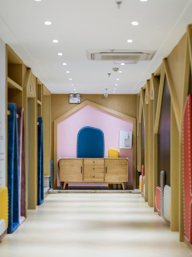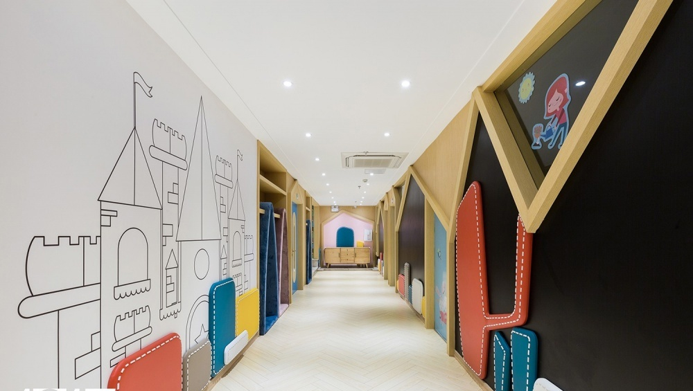 過道的兩旁,是童話與現實的相遇,即使是早教中心,但是在環境上還是要更貼近小朋友的內心,設計師將簡筆畫的城堡印在墻上,用一塊塊不規則的皮質做成不一樣的造型,將童話里的矮木叢和樹林帶入到孩子們的心靈世界,溫馨而有創意。