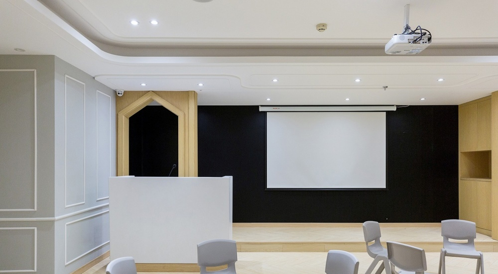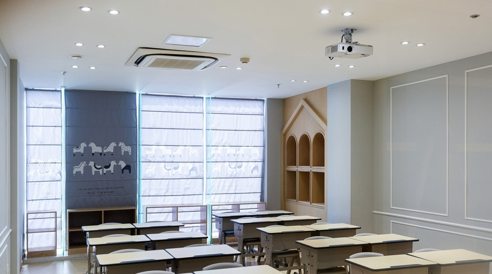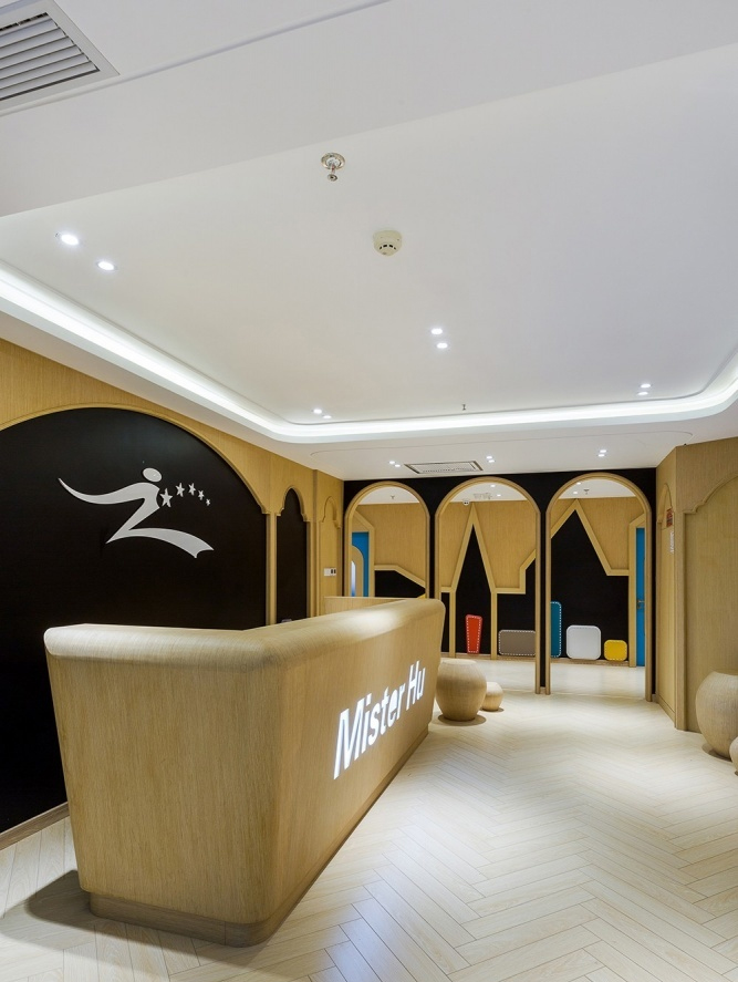 在培訓教室中,用木質的城堡房屋的造型作為隔斷,將講臺區域與課桌區分開,整體造型和前臺相呼應,為孩子營造了一個更好的環境。