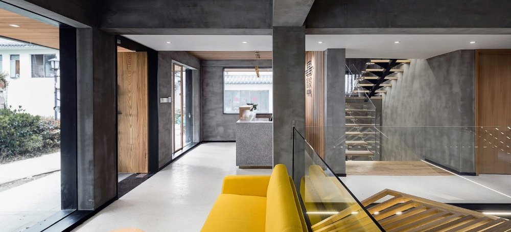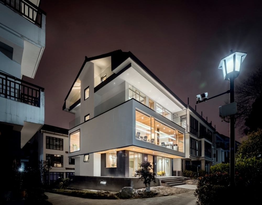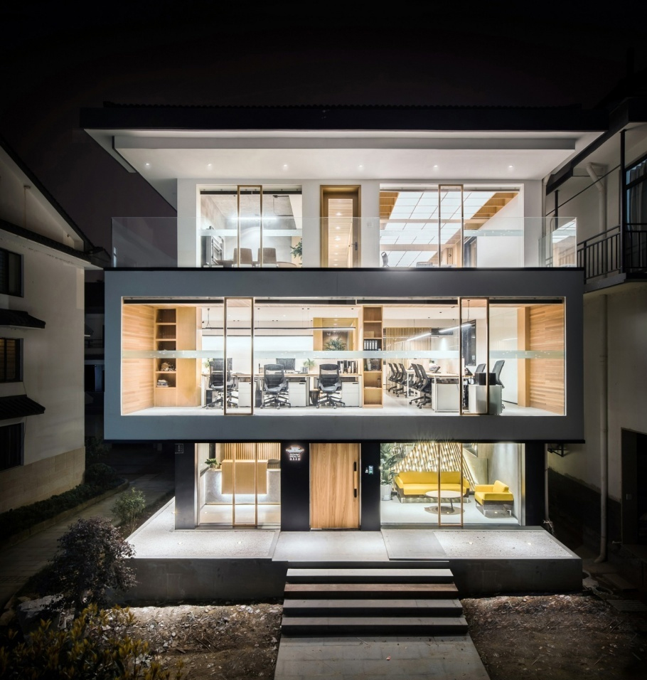 本項目位于杭州白沙泉并購金融街區,建筑原本是一幢地處村落中心的4層的民居毛坯房,建筑周圍有一圈簡單種植的綠化庭院。甲方的訴求是其整體空間要具有創新、實用、舒適且在當地具有獨樹一幟的總部特征形象,不是單純的以材質的堆砌、形式的繁瑣、來達到造型的效果。