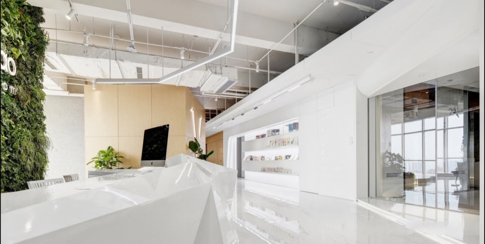 門廳接待處背景墻設計采用真實植物進行裝飾,構成生態的室內空間,提升空間使用的舒適度。前臺的設計運用體塊切割的方式做成不規則的形狀,以到達從不同的角度