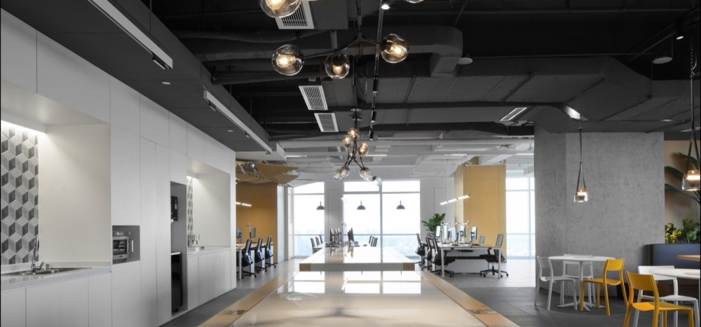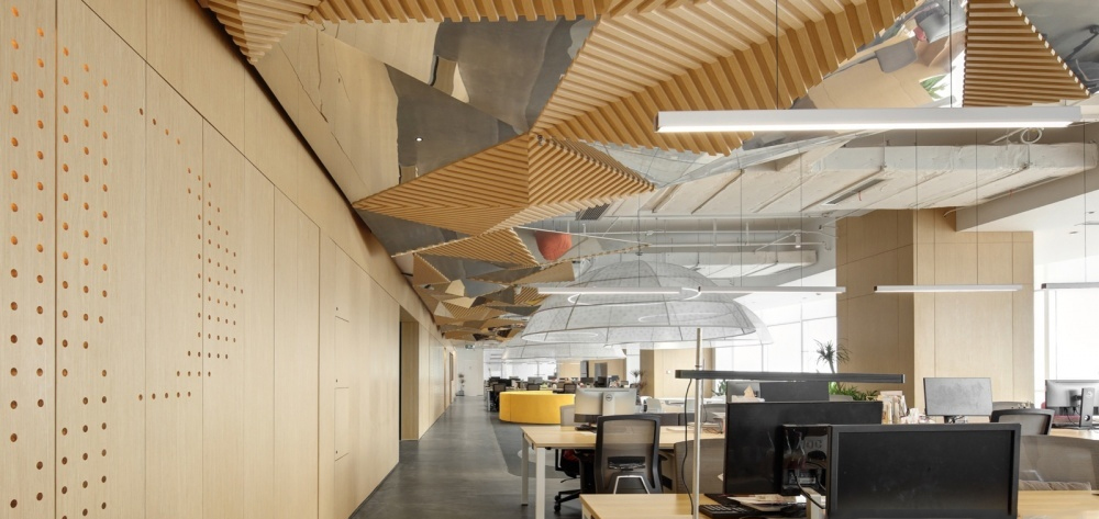 穿越員工休息區,就到達了辦公室的員工工作區,這里采用局部吊頂的設計,由三角形元素組合而成的“鉆石吊頂”劃分了空間頂部構成,挑戰了使用者的視覺體驗,不僅豐富了辦公區域的層次,同時也增加了空間的趣味性。